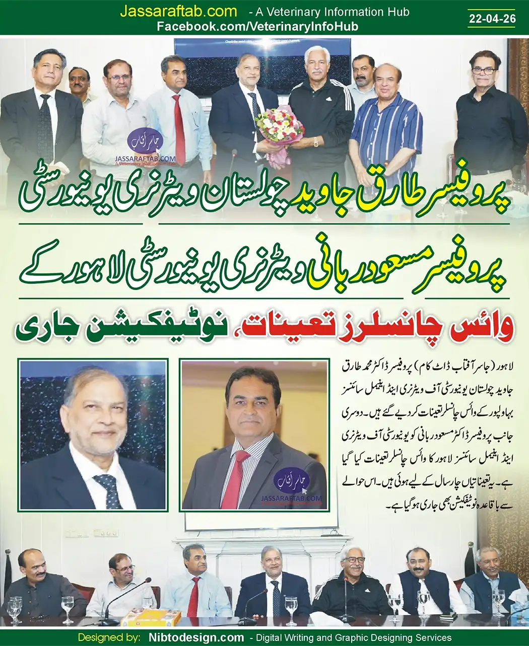 Professor Dr. Muhammad Tariq Javed has been appointed as the Vice Chancellor of Cholistan University of Veterinary and Animal Sciences Bahawalpur. On the other hand, Professor Dr. Masood Rabbani has been appointed as the Vice Chancellor of University of Veterinary and Animal Sciences Lahore. These appointments of vice chancellors, VC UVAS Lahore and VC CUVAS Bahawalpur have been made for a period of four years. A formal notification has also been issued in this regard.