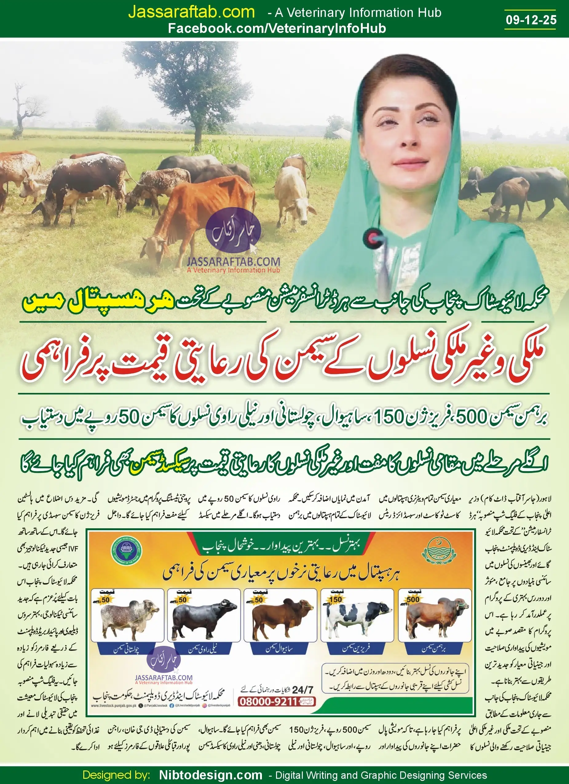 According to the information released by the Livestock Department of Punjab, under the project, quality semen of domestic and foreign breeds with high genetic potential is being provided at cost-to-cost and subsidized rates in all veterinary hospitals.
