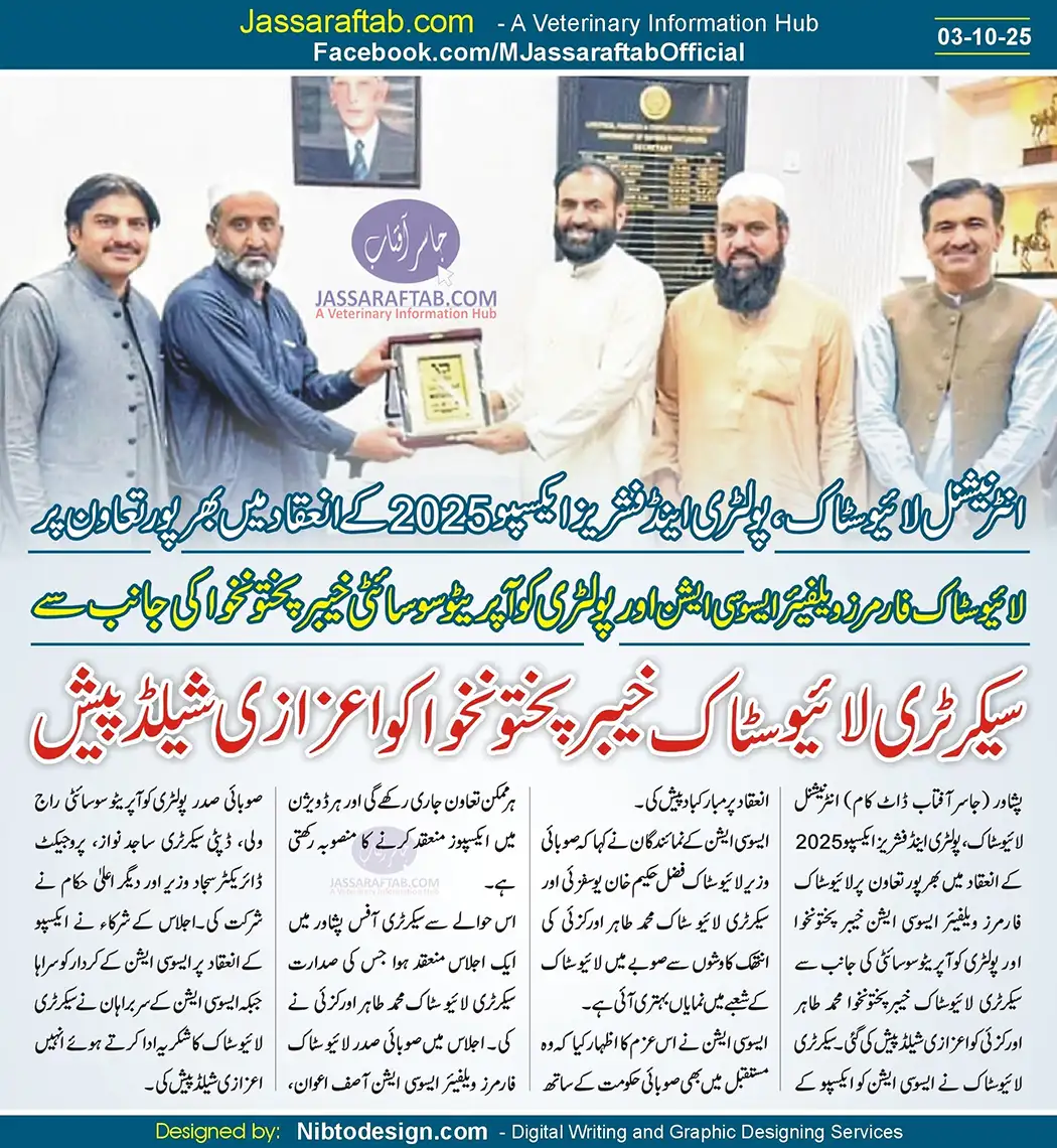 The Livestock Farmers Welfare Association Khyber Pakhtunkhwa, and the Poultry Cooperative Society presented a shield of honor to Secretary Livestock Khyber Pakhtunkhwa, Muhammad Tahir Orakzai, for his full cooperation in organizing the International Livestock, Poultry, and Fisheries Expo 2025. The Secretary Livestock KPK congratulated the association on organizing the expo.