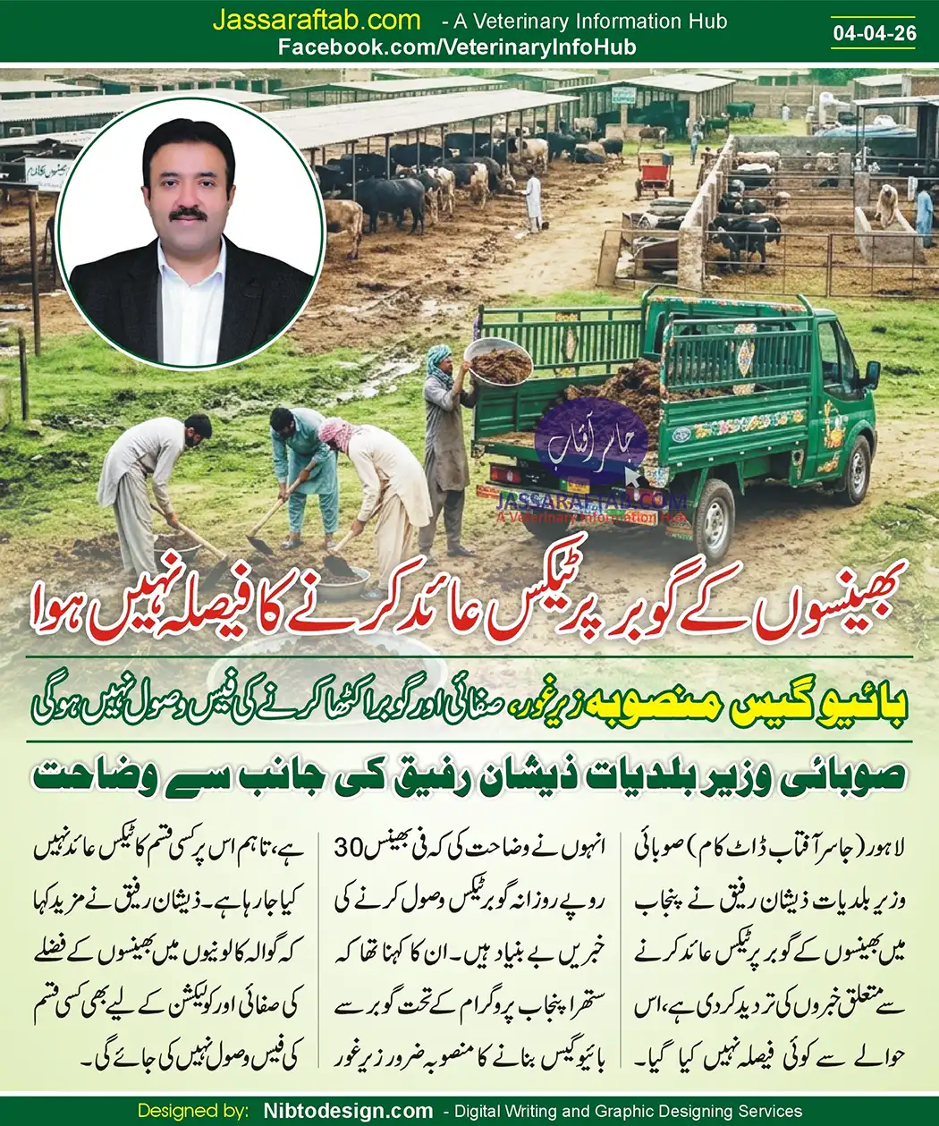 Provincial Minister for Local Government Zeeshan Rafique has denied the news about imposing tax on buffalo dung in Punjab. He said that no decision had been taken in this regard. He clarified that the news of collecting a daily dung tax of Rs 30 per buffalo is baseless. He said that the plan to make biogas from dung under the Clean Punjab Program is definitely under consideration, however, no tax is being imposed on it. Zeeshan Rafique further said that no fee will be charged for cleaning and collection of buffalo waste in Guwala colonies.