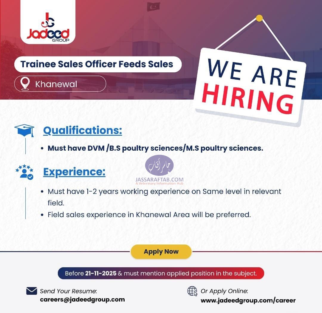 Jadeed Group has announced a poultry feed sales job as Trainee Sales Officer Feeds Sales. However, this poultry job or jadeed group job requires candidates with DVM, B.S Poultry Sciences, or M.S Poultry Sciences. Moreover, the company prefers candidates with 1–2 years of field sales experience, especially in the Khanewal region.