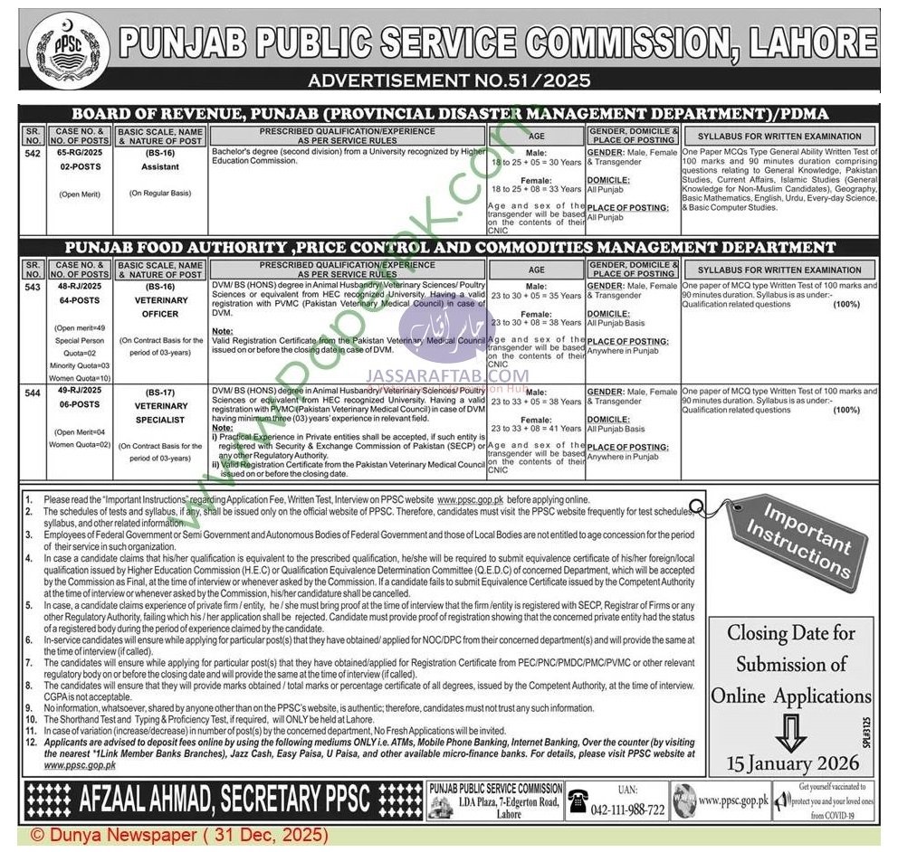 The Punjab Public Service Commission (PPSC) has announced new veterinary jobs in Punjab Food Authority. However, these PPSC veterinary jobs, Punjab Food Authority Jobs and PFA Jobs require candidates for the Price Control & Commodities Management Department. Currently, 64 Veterinary Officer jobs (BS-16) are available on a three-year contract basis. Applicants must hold a DVM or BS (Hons) in Animal Husbandry/Veterinary Sciences. Moreover, valid PVMC registration is mandatory to apply for these posts.