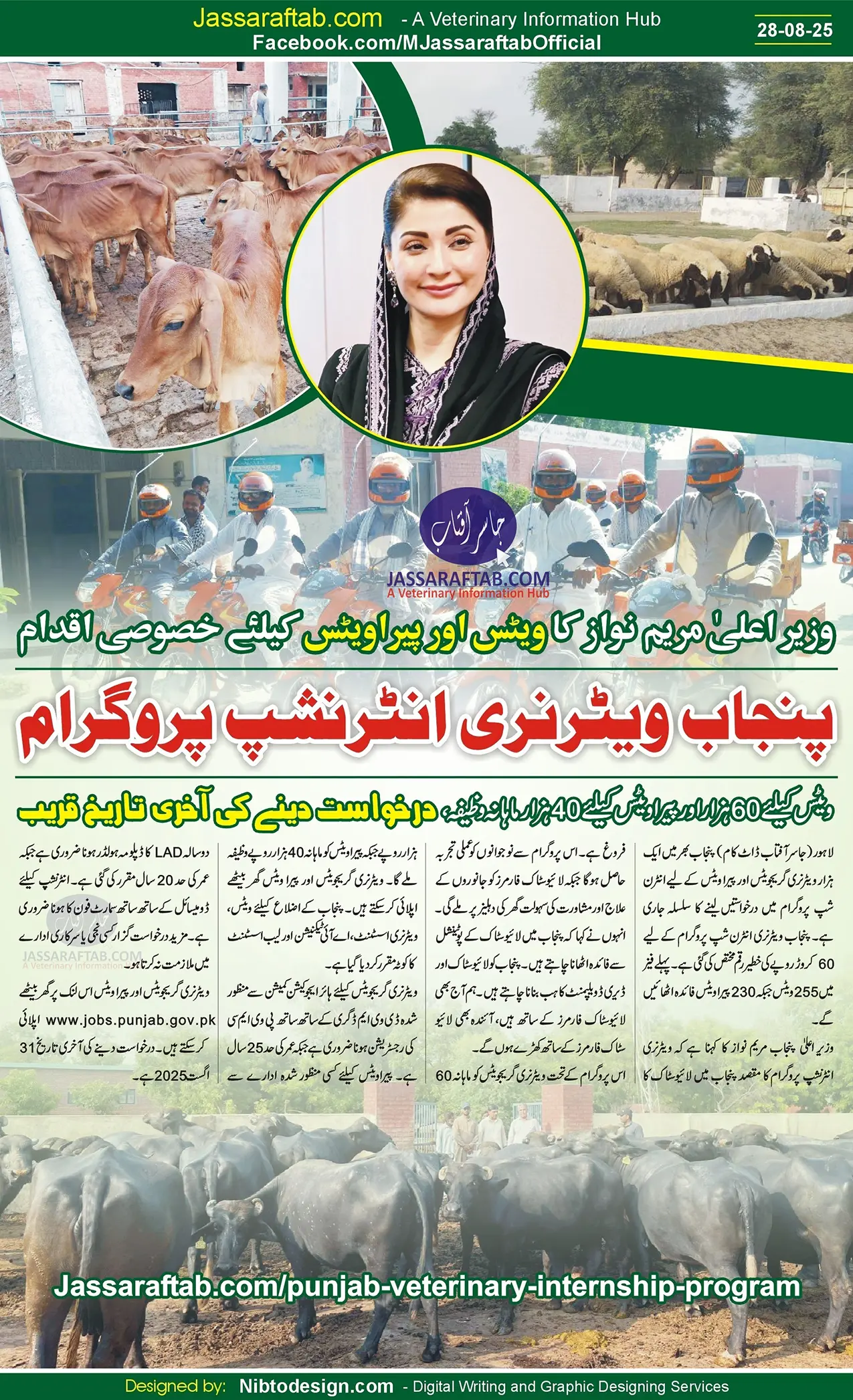 Chief Minister Punjab Maryam Nawaz says that the Punjab Veterinary Internship Program aims to promote livestock in Punjab. This program will provide practical experience to the youth, while livestock farmers will get the facility of animal treatment and consultation at their doorstep. She said that they want to take advantage of the potential of livestock in Punjab. They want to make Punjab a hub for livestock and dairy development. Government of Punjab is with livestock farmers today and will continue to stand with livestock farmers in the future.