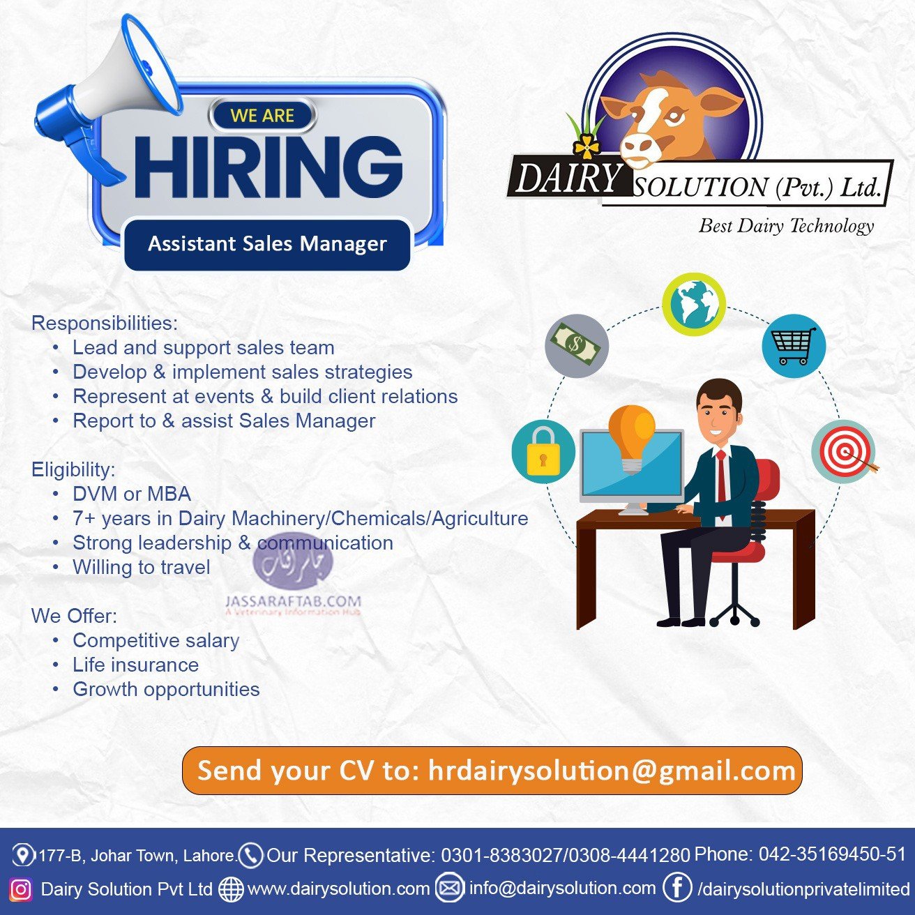 Dairy Solution Pvt. Ltd has announced an Assistant Sales Manager Job & Sales Officer Job. However, this DVM Job & Dairy Machinery sales job at Dairy Solution requires DVM or MBA. Moreover, applicants must have at least 7+ years of experience in dairy machinery, chemicals, or agriculture. Furthermore, they also have strong leadership & communication skills. The assistant manager role includes developing and implementing sales strategies while representing the company at events. In addition, he will report to and assist the Sales Manager to ensure smooth operations. However, company offers a competitive salary, life insurance, and excellent growth opportunities. Send your CV now to hrdairysolution@gmail.com and take the next step in your career.