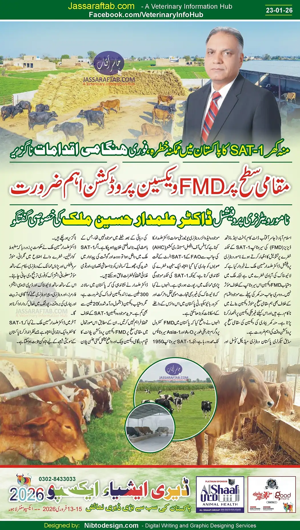 Leading veterinary expert Dr. Alamdar Hussain Malik has warned of a serious threat to Pakistan’s livestock. He said the possible entry of Foot and Mouth Disease – FMD SAT-1 serotype could cause heavy losses. He added that available FMD vaccines in Pakistan do not protect against SAT-1. Moreover, he emphasized the local FMD Vaccine Production.