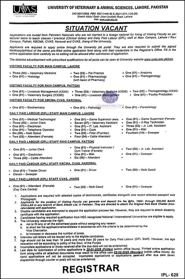 The Veterinary University Lahore has announced Veterinary Assistant Jobs & Livestock Assistant Jobs for multiple campuses. However, these Jobs at UVAS require two years’ diploma of Veterinary Assistant or Livestock Assistant from a recognized Institute. Furthermore, University of Veterinary and Animal Sciences is also hiring daily paid labour for main and other campuses as well. These Daily paid labour jobs at main campus include Medical Technologist (1), Junior Clerk (3), Electrician (1), Telephone Operator (1), Naib Qasid (6), and Attendant Female (2).