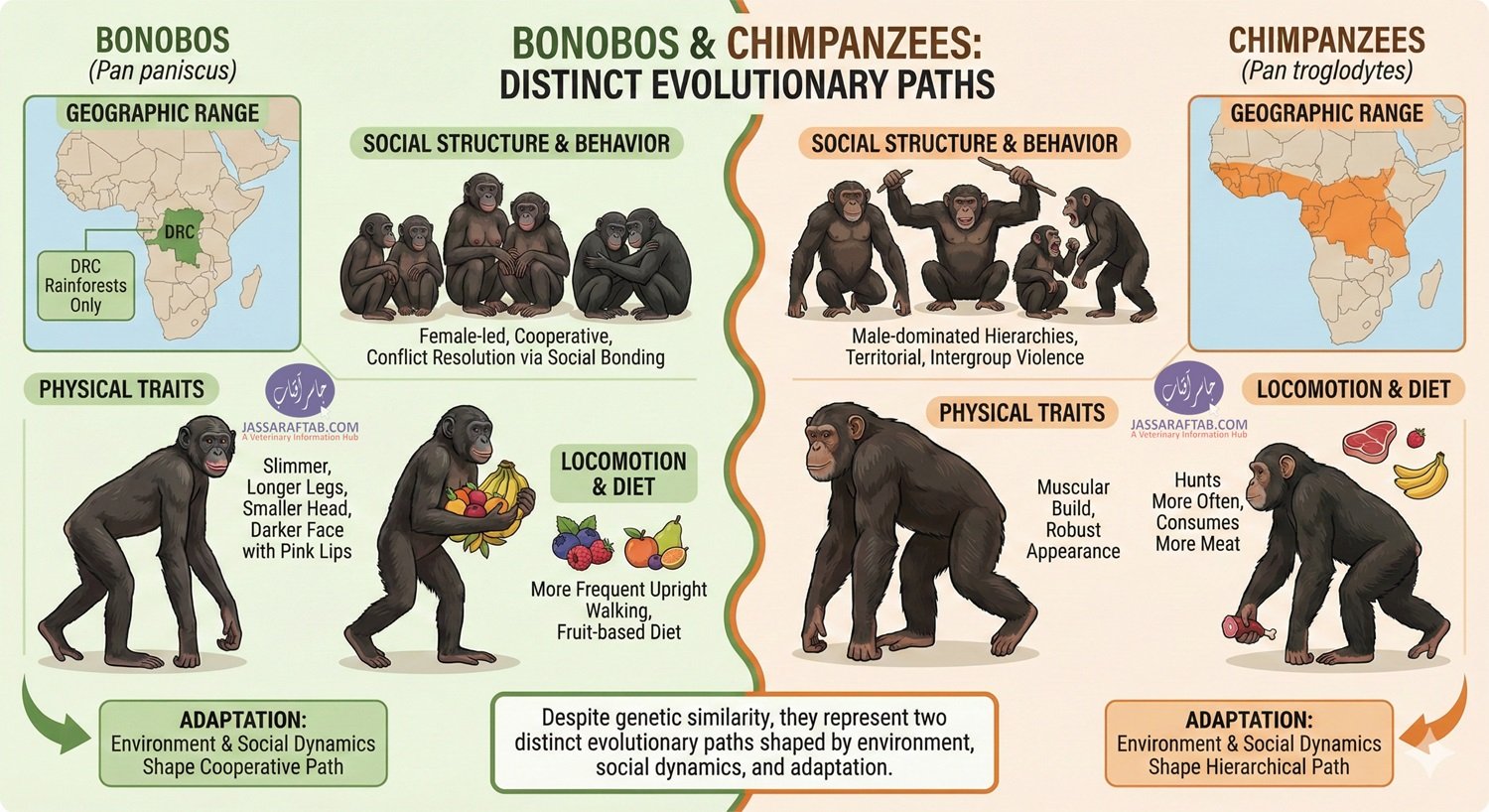 Physically, bonobos appear slimmer, with longer legs, smaller heads, and darker faces with pink lips, while chimpanzees have a more muscular build and a robust appearance. Moreover, bonobos tend to walk upright more frequently and rely heavily on fruit-based diets, whereas chimpanzees hunt more often and consume more meat. Therefore, despite their genetic similarity, bonobos and chimpanzees represent two distinct evolutionary paths shaped by environment, social dynamics, and adaptation.