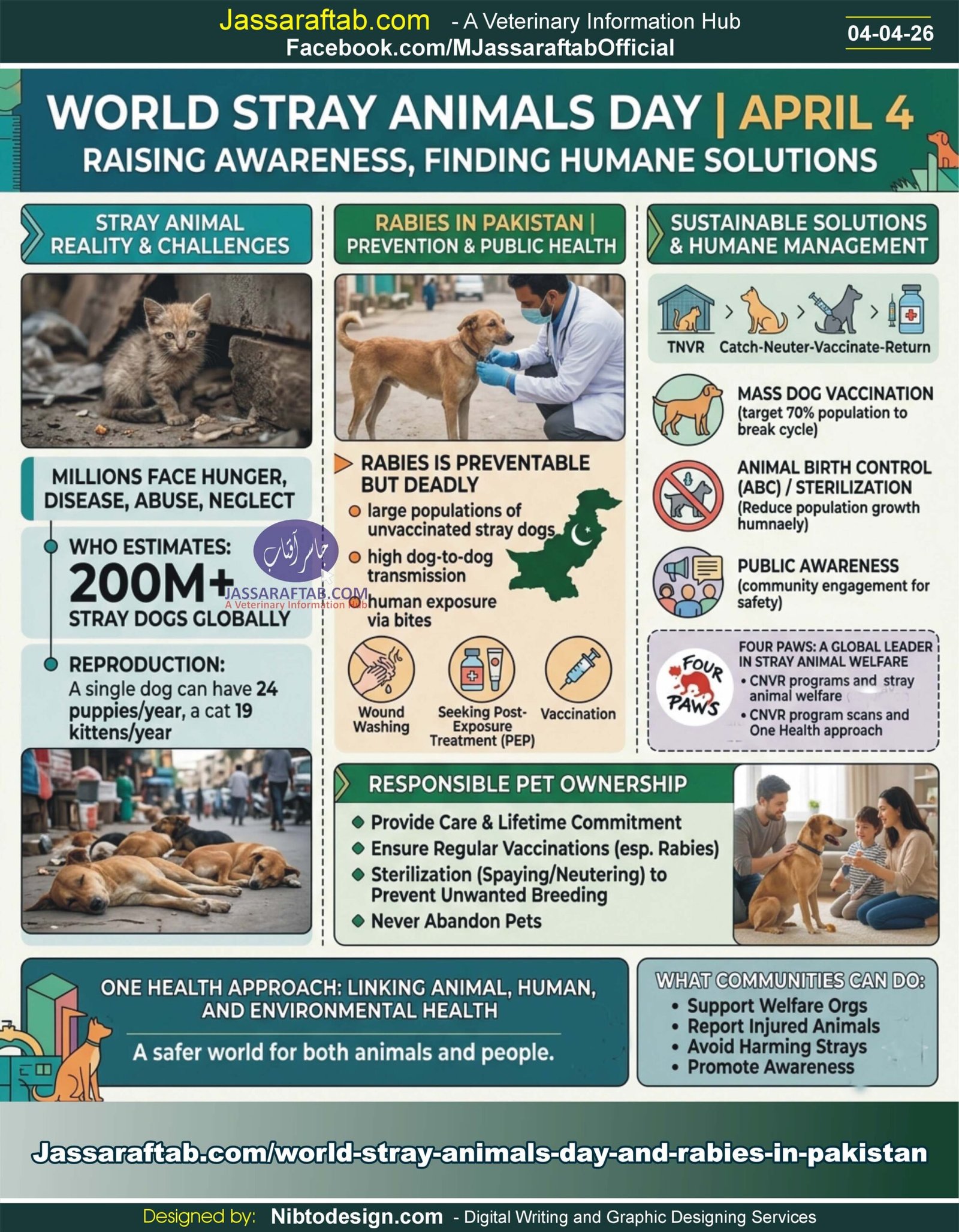 World Stray Animals Day, observed on April 4 every Year. It raises awareness about the suffering of stray animals. This day highlights the growing global crisis of stray dogs and cats and the urgent need for humane solutions. This day focuses on improving the lives of stray dogs and cats. It highlights issues like hunger, disease, abuse, and lack of shelter, which are core animal welfare concerns. Therefore, the day promotes humane treatment, compassion, and protection of stray animals. WSAD or World Stray Animals Day also promotes effective Rabies Prevention through vaccination. Rabies in Pakistan is preventable but still deadly. However, with coordinated efforts, humane strategies, and community participation, elimination is achievable.